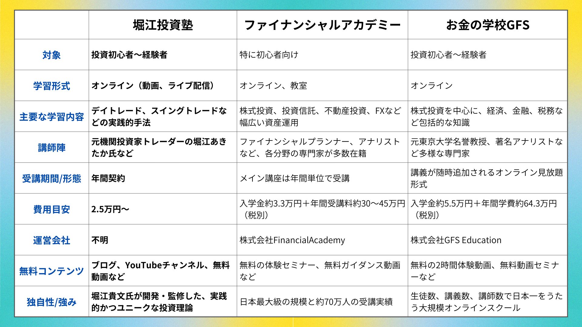 そこで、堀江投資塾とその他の人気の投資塾といくつかの点で比較して、まとめてみました。